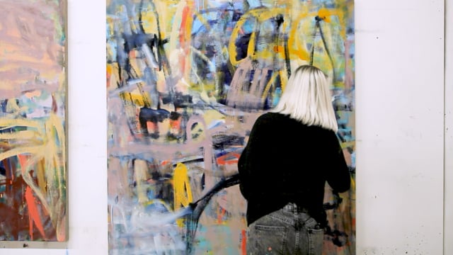 Might we still experience this form of empathy if what we’re witnessing is not a living, moving being, but rather a static, abstract image? This is a question at the heart of Catherine Long’s art. She is a painter whose practice is deeply informed by her background in somatic dance (a discipline that emphasizes the dancer’s internal physical perception and personal embodied experience), and on one level, her paintings may be said to trace the movements she makes in her studio, as she applies pigment to the surfaces of her customarily large-scale canvases. Long, who often works on multiple compositions at the same time, has described how she will ‘take a moment to dance’ as she switches between one emerging image and another. Beyond selecting the size of her supports, and creating an initial colour palette, nothing is pre-planned about her painting process. It is rather, as she has said, ‘instinctive’, and involves not only an awareness of pictorial space, but also how she inhabits physical space as she labours — the reach of her arms, the bending and straightening of her knees, feeling the pull of gravity on both her body and her paint.