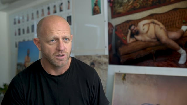 I belong to this brings seventeen artists together around themes of self and family, private rites and communal ritual, along a continuum of becoming. The title of the show is from Ariana Reines’s poem “Save the World”, and can be read as a declaration of identification, a promise of solidarity, or a blurring of self into multitudes.1 These artists mark an intractable this. The camera points, more like an ear than an index finger, in the direction of what is felt rather than seen and to those invisible threads that hold us together. Keisha Scarville camouflages her body in her late mother’s clothing, embraced in the fabric and levitated by it. Over her mother’s matrimonial photograph, Cheryl Mukherji embroiders her mother’s words, “Promise me you will not become like me.” For these artists, as with Genesis Báez, the symbiotic connections to the mother’s body and to the motherland are the first condition of photography. In Lifting Water, 2017, a large glass cylinder of water balances precariously between Báez and her mother: the ocean between Puerto Rico and New York. Sydney Mieko King reverses time; plaster casts of her body are projected onto archival photographs of her maternal grandmother. The projection rests, ghostlike, on an intermediary glass pane, invisible except for a star of masking tape to prevent the pane from shattering. Depictions of violence and religiosity sit in uneasy proximity in Calafia Sanchez-Touzé’s allegorical tableaux of her family. Sanchez-Touzé pictures her mother prostrate across a bed, genuflecting in a posture of grief or mourning.