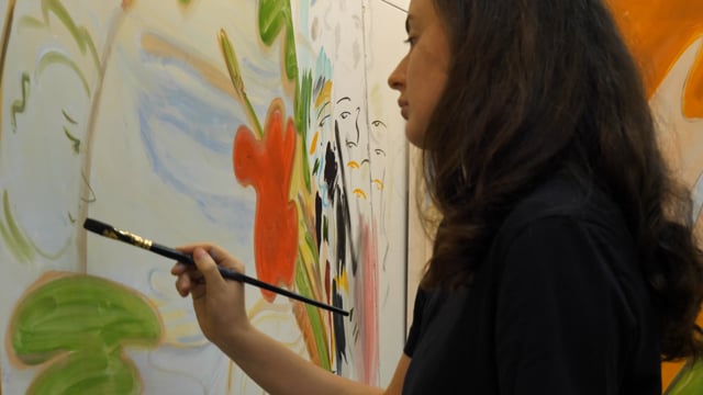 Our exhibition of new works by Yulia Iosilzon, featured in Fanfarria, explore notions of hedonism, escapism and fantasy through the artist’s signature use of bold colours, and free-flowing calligraphic lines, laced with layers of symbolism and repeated motifs.
